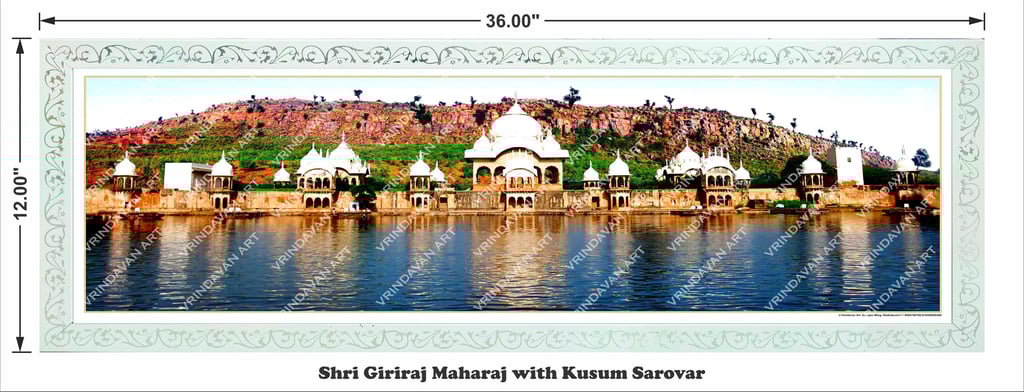 Vrindavan Art | Kusum Sarovar with Giriraj Talheti Goverdhan Darshan – Sacred Braj Landscape Panorama | Spiritual Wall Art for Home & Office Decor – White Frame | 12x36 inch (30.48 x 91.44 cm)